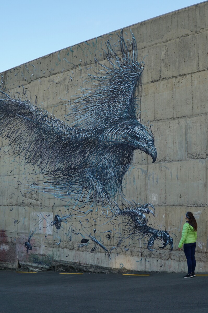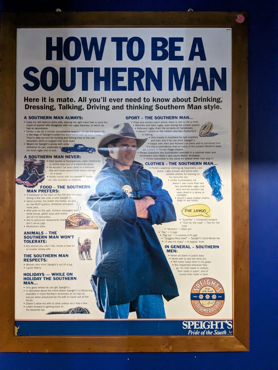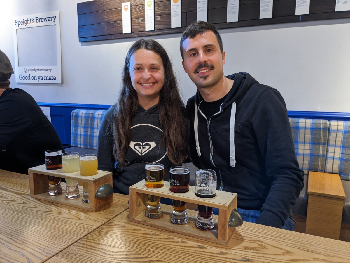 Der darauffolgende Tag startete mit der Fahrt zum Nugget Point, einem Leuchtturm an den Klippen, vor denen mehrere malerische Felsen wie „Nuggets“ aus dem Meer ragen. Danach ging es zur zweitgrößten Stadt der Südinsel, nach Dunedin (sprich „Danidn“), wo wir dann mehrere Nächte bleiben sollten. Am nächsten Morgen ging es zum Tunnel Beach, schon wieder ein sehr schöner Platz an der Küste, wo sogar ein kleiner, handgegrabener Tunnel zum Meer hinunterführt. Nachmittags machten wir eine Führung durch die Speight’s Bierbrauerei mit anschliesender Verkostung. Die meisten Bierkreationen konnten uns überzeugen, vor allem das prämierte Gold Medal Ale trinken wir jetzt fast täglich 😉 Danach machten wir noch einen Street-Art-Spaziergang durch das sonntags ausgestorbene Stadtzentrum. Zum Sonnenuntergang versuchten wir unser Glück mit den Gelbaugenpinguinen nochmal am Sandfly Beach, der lustigerweise nicht wegen den gleichnamigen Insekten-Biestern so heißt, sondern weil es immer windig ist und der Sand umherfliegt.