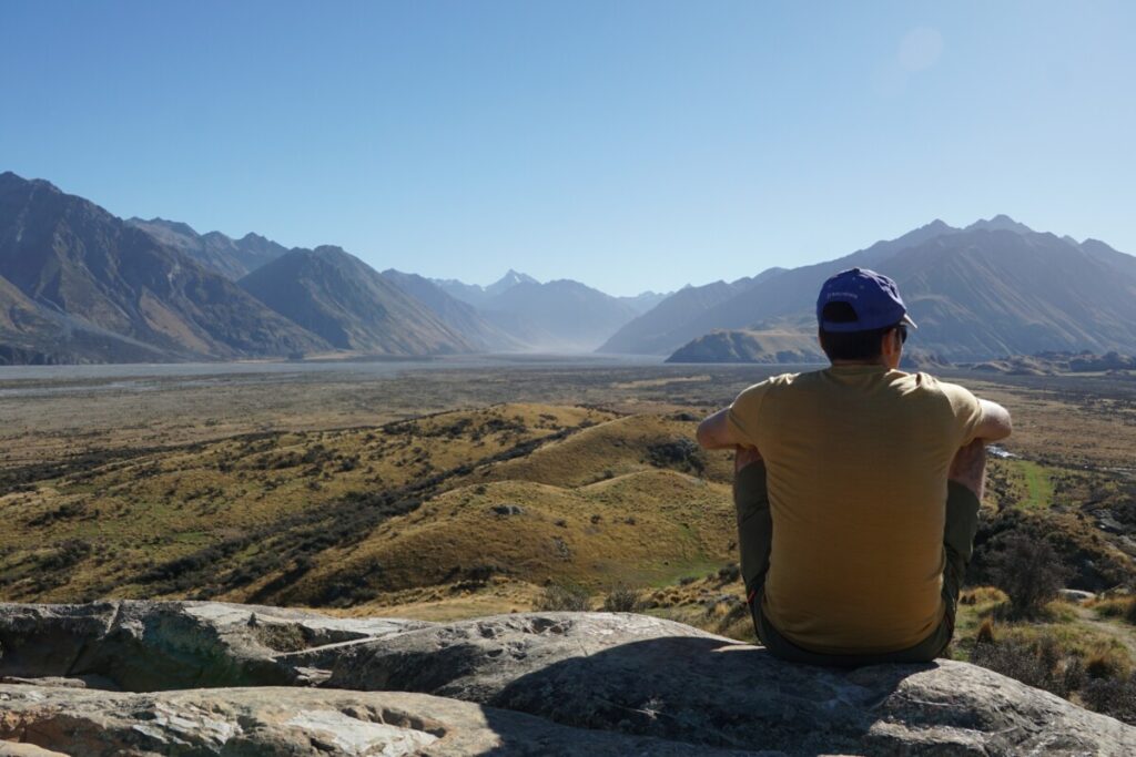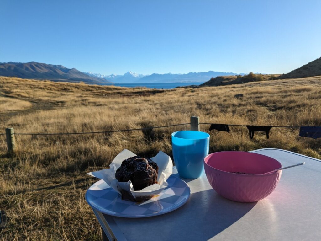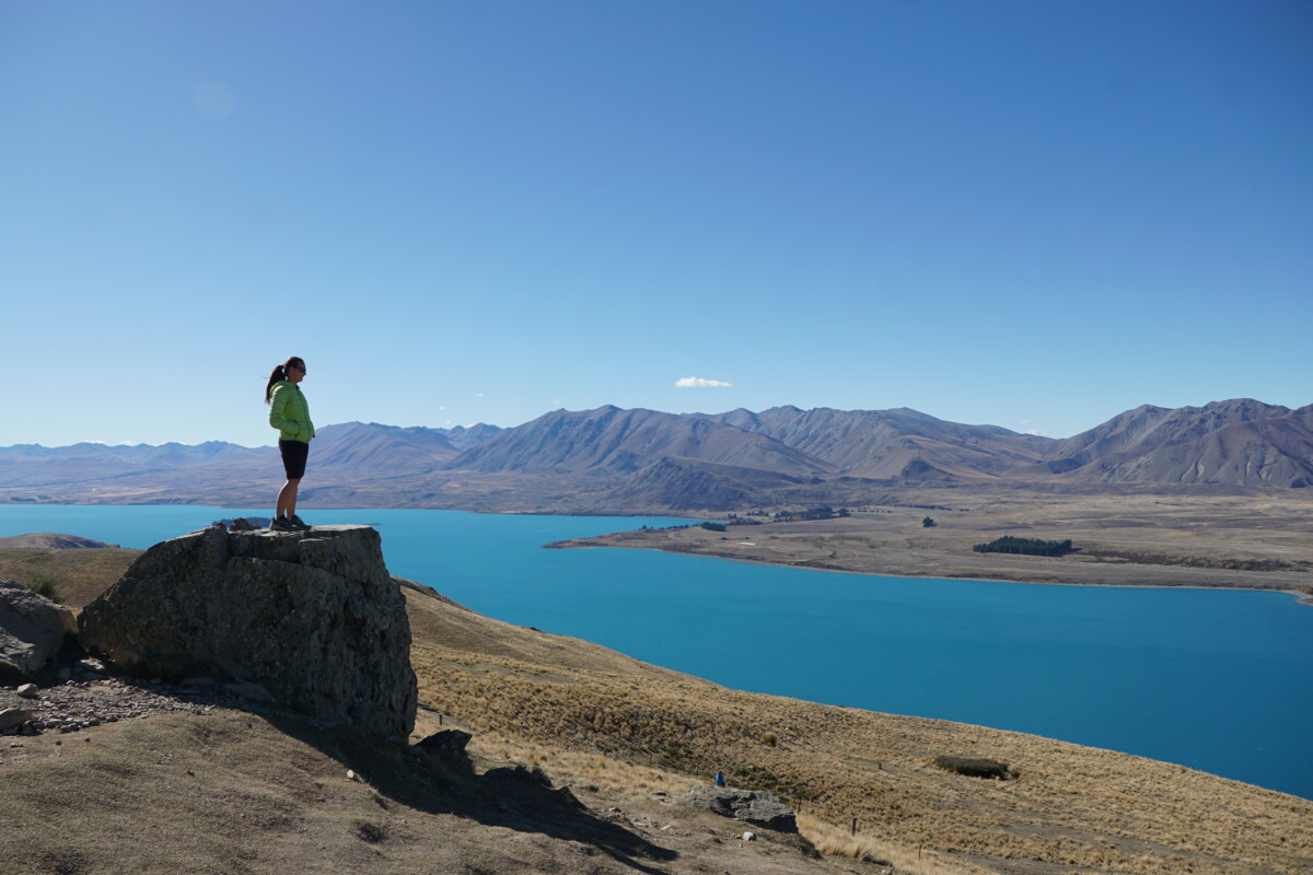 Für unsere letzte Woche in Neuseeland hatten wir nochmal ein Traumwetter – meist wolkenlos! Am türkisblauen Lake Tekapo noch eine kleine Wanderung, bevor es nach Timaru ins Schwimmbad ging. Am darauffolgenden Tag entschieden wir uns aufgrund des herrlichen Wetters, nochmal ins Landesinnere in die Berge zu fahren, genauer gesagt zum Herr-der-Ringe-Drehort für Edoras und Helms Klamm. Die Fahrt dorthin führt über eine ewig lange Schotterstraße, vorbei an nur noch vereinzelten Farmen. Eine kurze Wanderung bringt einen auf den Mount Sunday, der so heißt, weil sich dort früher immer sonntags die umliegenden Farmer getroffen haben. Die Aussicht in die unbewohnten Täler ist wirklich spektakulär. Wir übernachteten einfach auf dem Wander-Parkplatz, und am nächsten Morgen ließen wir uns ein Frühstück im wohl abgelegensten (und komplett autarken) Café Neuseelands schmecken, der Mt. Potts Lodge. Nach sehr kalorienreichen Eggs Benedict und Pancakes brauchten wir einen Verdauungsspaziergang, weshalb wir den Lake Clearwater in 2,5h umrundeten. Ursprünglich wollten wir zwar einen Gipfel besteigen, aber irgendwie fehlte uns dann die Motivation, wohl ausgelöst durch maßloser morgendlicher Völlerei.