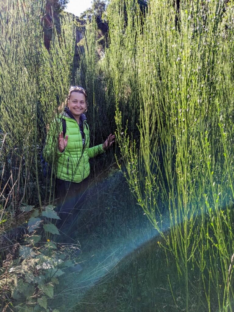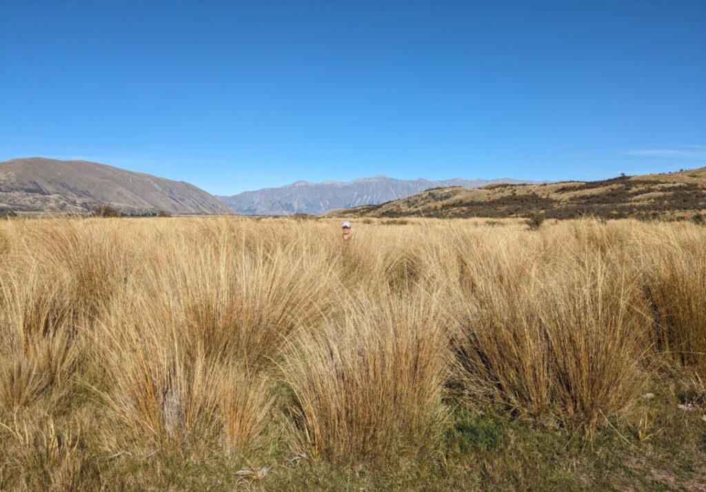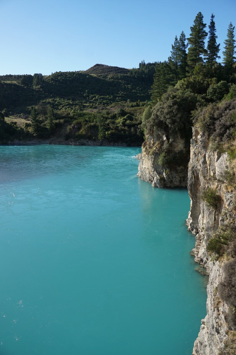 Das Tagesziel war eigentlich die Whitecliffs Domain, ein ruhiger Freedom Campingplatz. Auf dem Weg dorthin fuhren wir an einem Fluss vorbei, der wunderschön türkisfarben heraufleuchtete, da mussten wir natürlich stehen bleiben und uns das näher anschauen. Ein etwas zugewachsener Weg führt in die Rangitata River Gorge, aber leider hat man nur selten Aussicht auf das verlockend blaue Wasser.