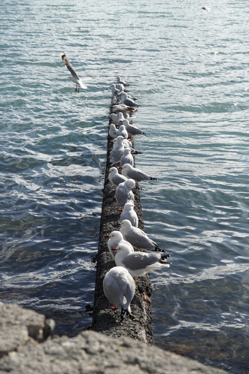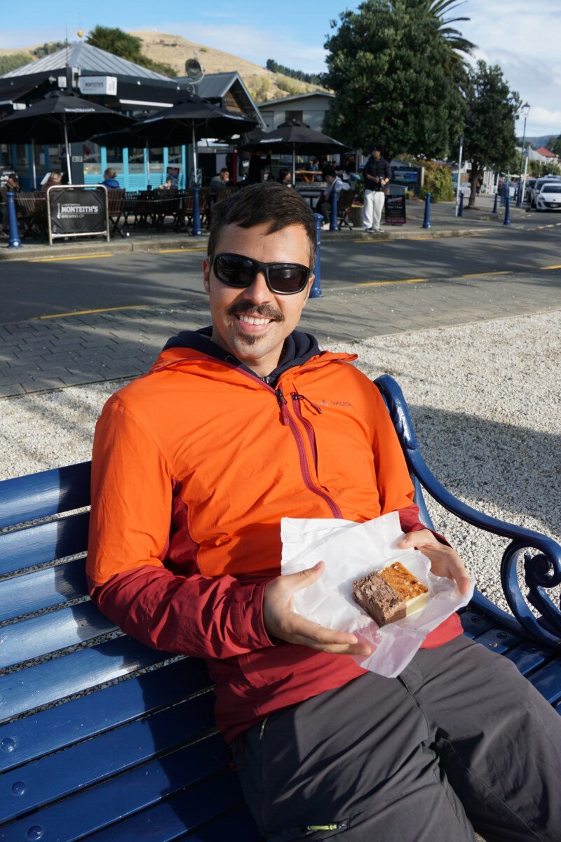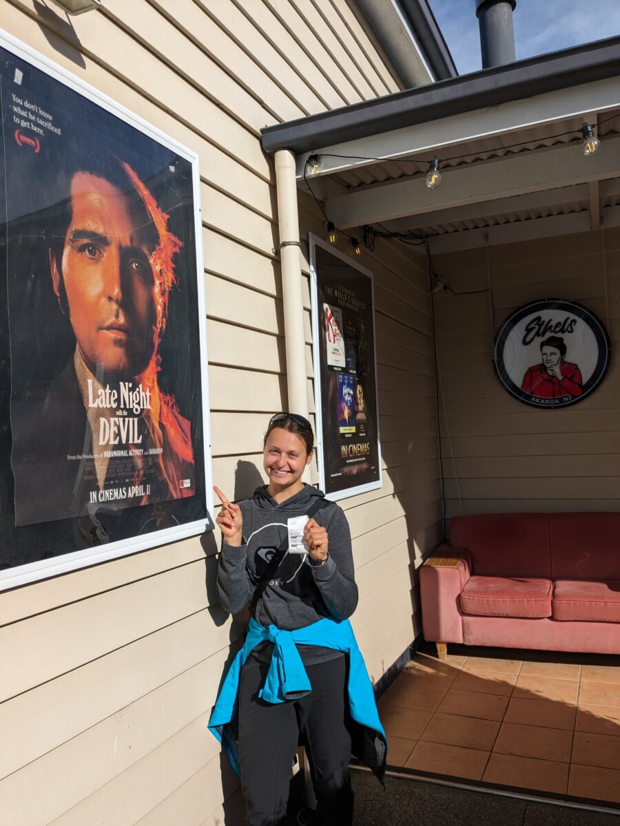Wir schliefen in der Hafenstadt Lyttleton, da die kostenlosen Stellplätze in Christchurch und Umgebung leider Mangelware sind. Am nächsten Tag wollten wir über die Bergstraße nach Akaroa auf die Banks Peninsula fahren, mussten dann aber auf dem Berg oben feststellen, dass Teile der Straße wegen Steinschlags gesperrt sind. Wir kehrten also um und fuhren über die normale Straße die anderthalb Stunden nach Akaroa auf der Halbinsel. Das kleine Städtchen durch seine Historie französisch angehaucht, überall findet man Bistros, Brasseries und Restaurants. Abends besuchten wir sogar ein winziges Kino und schauten uns den schrägen Psycho-Horrorfilm „Late Night with the Devil“ an, den sich überraschenderweise Romana ausgesucht hatte.