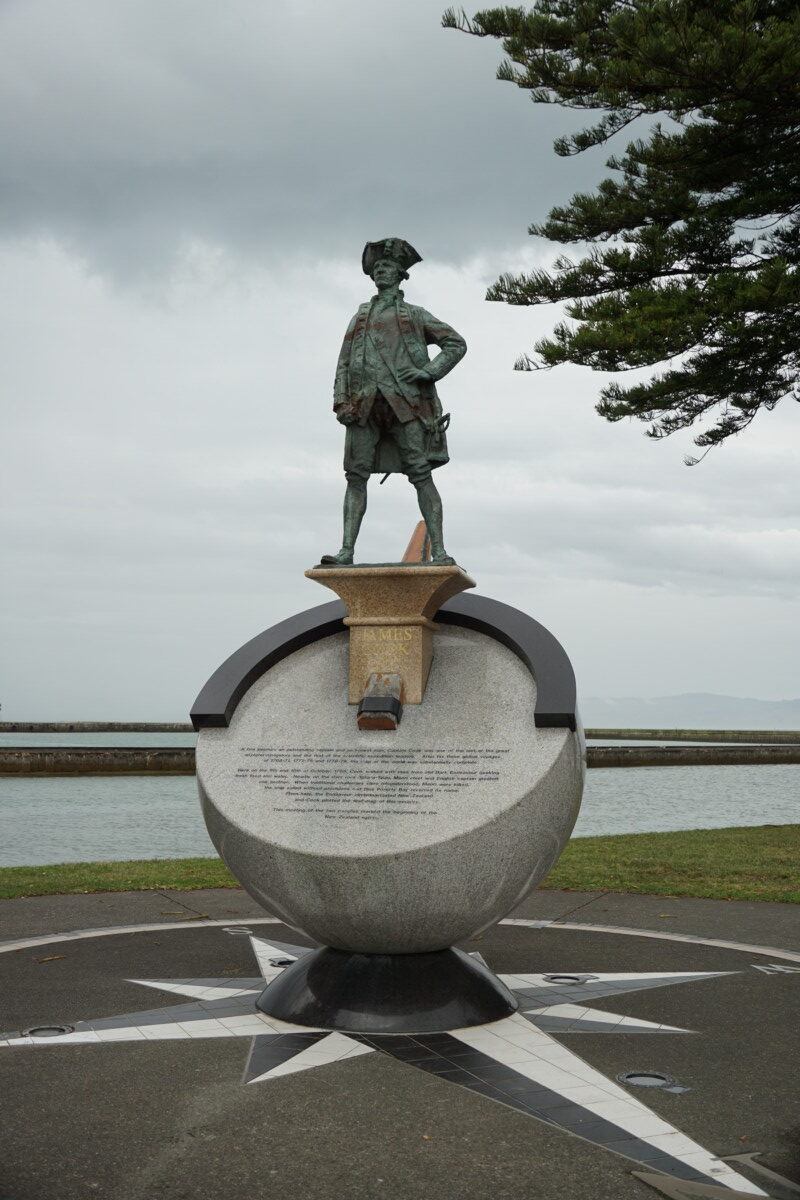 Im Reiseführer-Buch erfuhren wir, dass auf dem Stadthügel eine Statue vom bedeutenden Seefahrer und Kartograph James Cook eine viel belächelte Statue stehen soll, da sie keine Ähnlichkeit mit Cook aufweist und er eine italienisch anmutende Uniform trägt. Wir konnten „The Crook Cook“ dann gar nicht finden und fanden dann heraus, dass die Statue immer schon umstritten war und 2019 nach Maori-Protesten in ein Museum verlagert wurde.