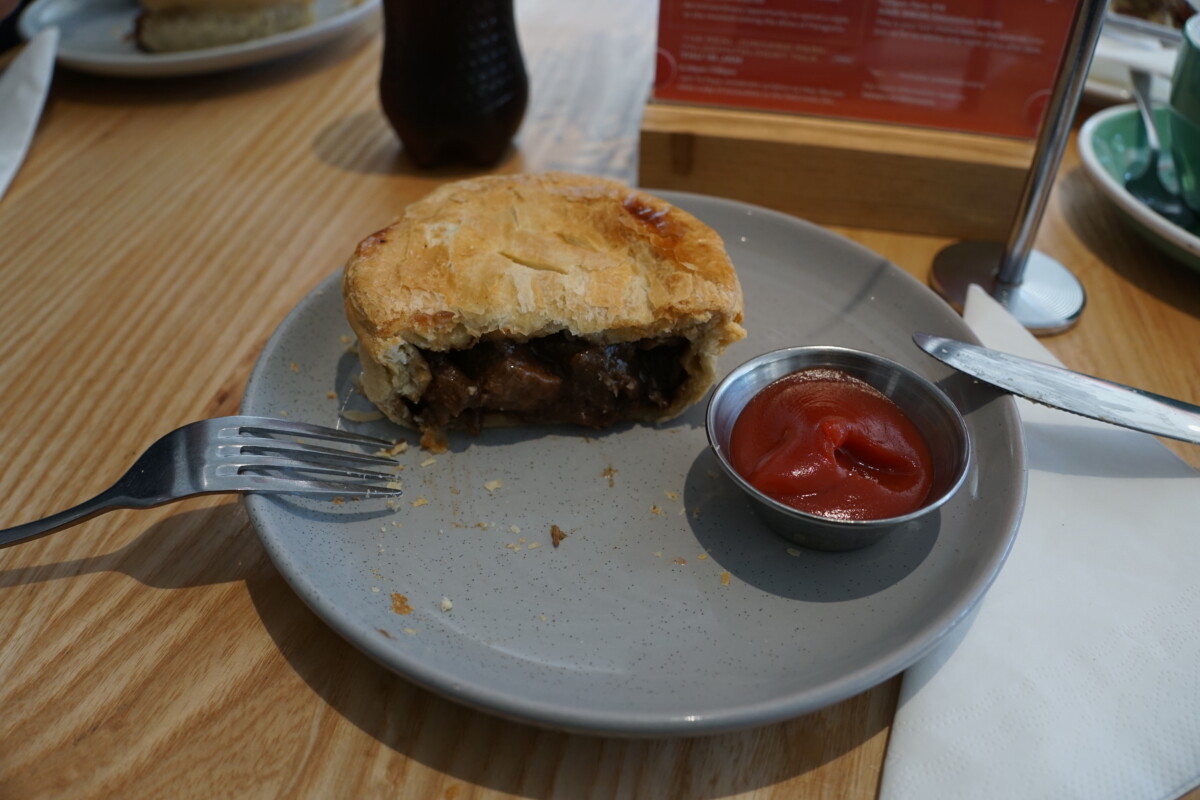 Seit wir mit unserem Van umherdüsen sind wir erst zweimal Essen gegangen, sonst haben wir immer selbst gekocht. Es gab bereits Chili con Carne, Reisfleisch, Gemüsepfanne, Tomatennudeln, Thunfischnudeln, Steak mit Gemüse, Curry, Bratkartoffeln, Pellkartoffeln und noch so einiges mehr. Zu Mittag wird manchmal gejausnet oder wir holten uns auch schon öfters Pies von einer Bäckerei, die es mit den unterschiedlichsten pikanten Füllungen wie „Pepper-Steak“ oder „Mushroom Cheese“ gibt.