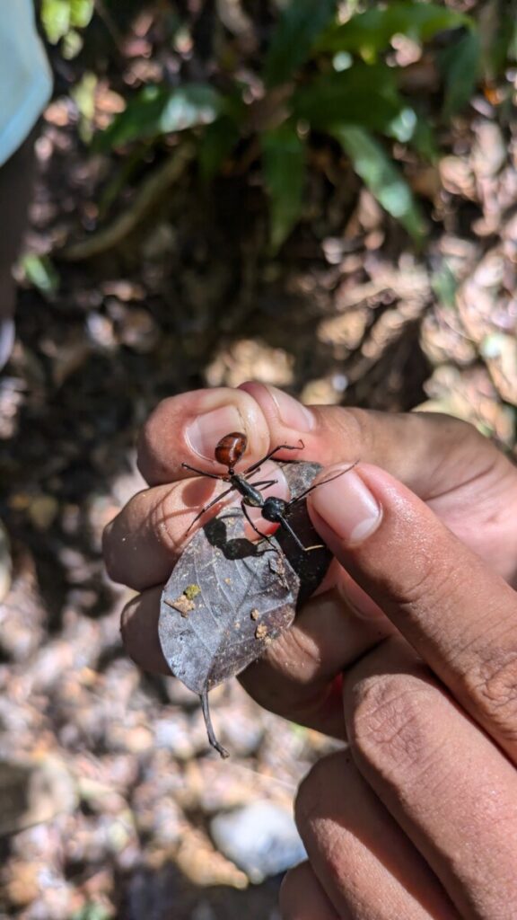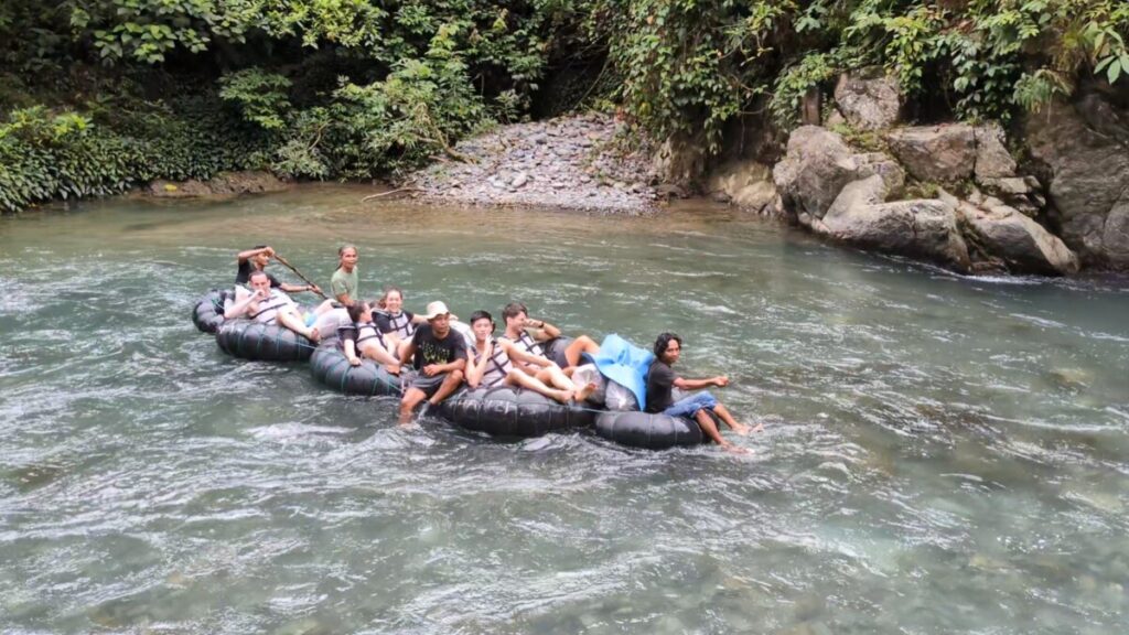 Beim Frühstück dann am nächsten Tag knallte plötzlich etwas direkt vor uns auf den Boden, Romana stieß einen so lauten Schrei aus, dass mir die Ohren klingelten. Ein Gangster-Affe war vom Dach heruntergesprungen und klaute sich die Kekspackung, deren Inhalt er sich dann genüsslich auf dem Dach hineinstopfte. Nach diesem lustigen Erlebnis gingen wir zu einem kleinem Wasserfall, wo zuerst uns die Guides mit Naturmaterialien ein “Jungle-Make-Up” verpassten und dann wir ihnen (siehe Titelfoto 😉). Das Rafting war dann ein “Schlauchreiten” mit zusammengeknoteten LKW-Schläuchen, machte aber wirklich Spaß und war ein gelungener Abschluss unseres Jungle-Trekkings!