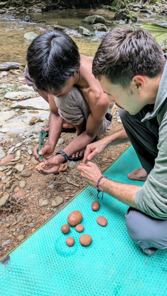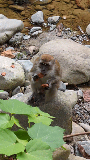 Am ersten Tag im Dschungel sahen wir neben einem riesigen Pfau dann gleich fünf verschiedene Affenarten: Orang Utans, Schweinsaffen, Thomas Leaf Monkeys, Braune Gibbons und Langschwanz Makaken, die auch als “Gangster-Monkeys” bekannt sind, da sie gerne Leute erschrecken und das Essen stehlen. Jajang erklärte uns wirklich sehr viel Interessantes, und Ali richtete eine unglaubliche Früchteplatte auf Bananenblättern für uns her. Am Nachmittag erreichten wir dann das Lager an einem kleinen Bach. Viele einfache Strohhütten stehen hier entlang des Wassers, die Touristen schlafen auf dünnen Matratzen in einem Moskitonetz, das von der Decke herunterhängt. Wir sprangen dann gleich ins kühle Nass, was für eine Wohltat, nachdem wir aufgrund der immensen Luftfeuchtigkeit komplett durchgeschwitzt ankamen. Ali erwies sich als Profi-Schnitzer und zeigte uns, wie man aus den Tonsteinen im Bach einen Orang Utan schnitzte. Ein eigener Koch wartete sogar auf uns, der uns dann viele gute indonesische Gerichte auf dem Boden sitzend servierte. Luxus mitten im Dschungel! 😉 Richtig tief kommt man mit den kürzeren Touren ja nicht rein in den Urwald, erst ab 4 Tagen wird dann das Lager immer neu aufgebaut mit Zelt usw., meinte unser Guide Jajang. Romana hatte leider wieder überhaupt keinen Appetit, aber zumindest war die Wanderung nicht zu anstrengend gewesen für sie.