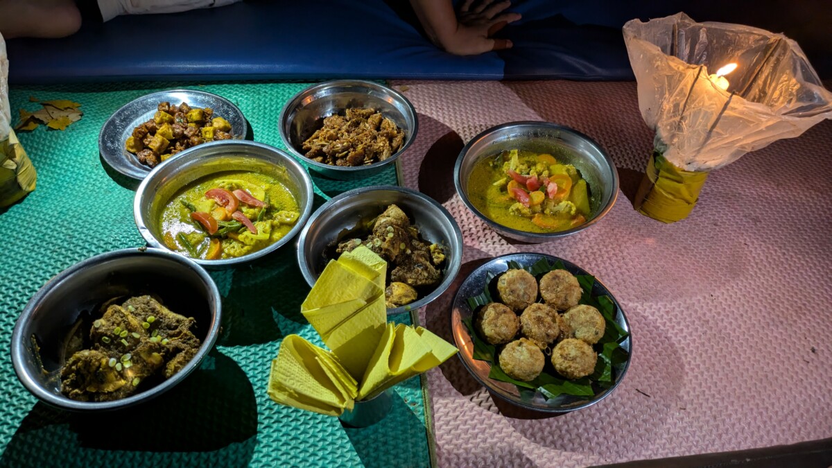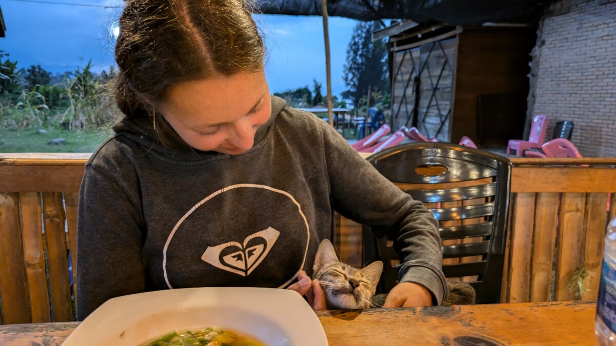 Auf dem Weg zu unserem Dinner kamen wir dann in einen richtigen Wolkenbruch im Tropengewitter und trafen tropfnass bei Josef ein, der uns aber sogleich mit einem Handtuch aushalf. Wir waren dann gespannt, als er sich entschuldigte, dass sein Koch nicht da sei, und er stattdessen für uns kochen würde… Wieder mal unterschätzten wir jemanden, denn das Essen (Nudelsuppe und ein Hähnchengericht) schmeckte wunderbar!