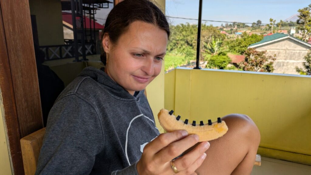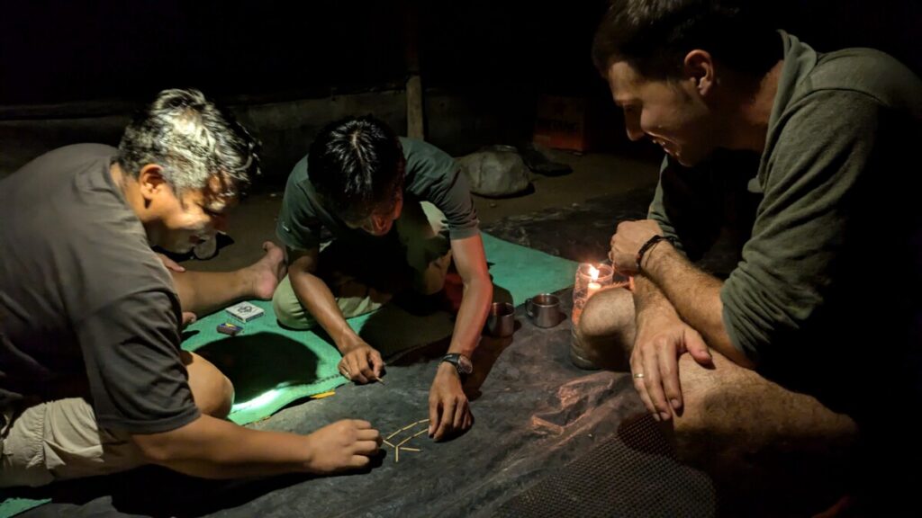 Abends brachten uns Jajang und Ali mit Streichhölzer-Rätsel zum Verzweifeln, dafür zeigten wir ihnen einen Kartentrick, der die beiden staunen und Ali noch lange grübeln ließ. Wir hatten echt Glück mit unseren beiden lustigen Guides! Nur bei Romana kam nun unnötigerweise auch noch der braune Blitz hinzu, genau das was man braucht fernab der Zivilisation…