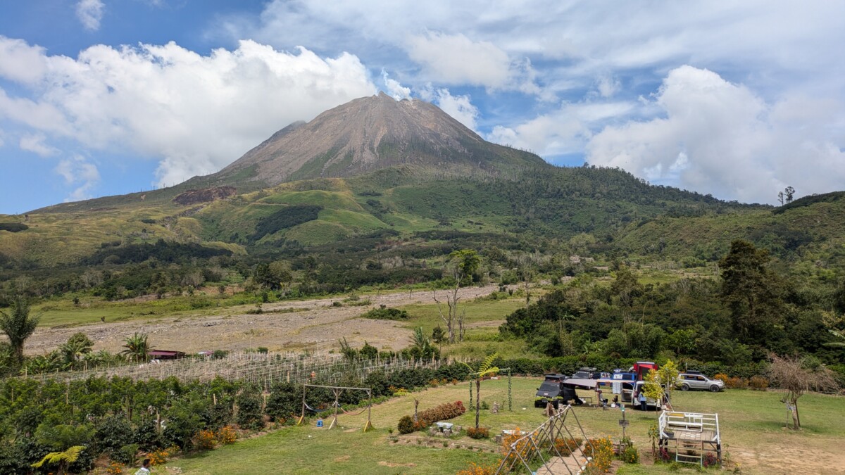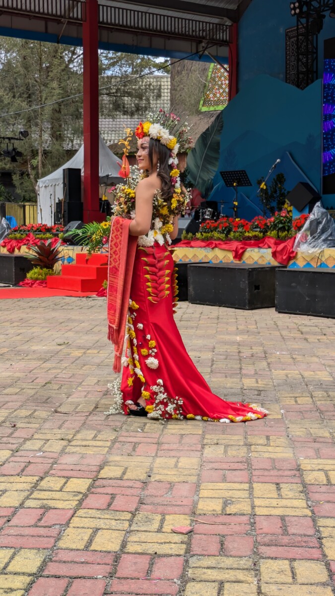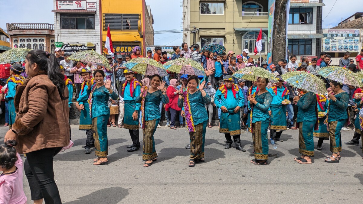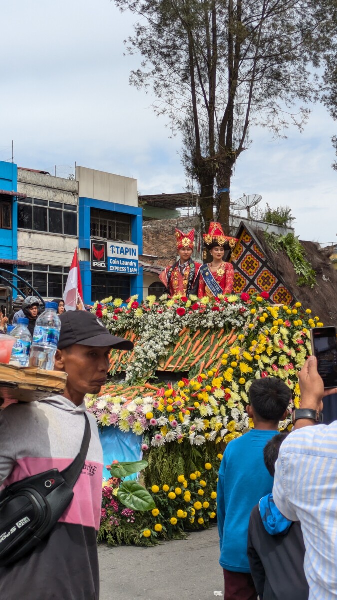 Der “Tourist-Bus” nach Berastagi war dann ein Auto, da wir insgesamt nur drei Fahrgäste waren. Für die nur 120 Kilometer brauchten wir 4 bis 5 Stunden, das zeigt wieder gut, wie schlecht die Straßen hier ausgebaut sind. Wenn dann noch eine Baustelle hinzukommt oder ein LKW an einer Engstelle vorbei muss, entstehen oft sofort Staus und Chaos und man kann erst nach Minuten wieder weiterfahren. Das Klima hier ist angenehm kühl, denn wir befinden uns auf über 1000 Meter Seehöhe. Während Romana sich auskurierte, war meine erste Tat in Berastagi eine Apotheke zu suchen, um  Kohletabletten und Hustensaft zu organisieren, denn Romana ging es noch nicht besser, auch am nächsten Tag noch nicht. Ursprünglich wollten wir hier ja auf den Vulkan Sibayak wandern, was aber aufgrund Romanas Gesundheitszustandes natürlich nicht möglich war. Stattdessen fuhren wir dann mit dem ausgeliehenen Roller am Donnerstag in die Stadt, da dort ein großer Erntedank-Umzug mit anschließendem Fest stattfand. Wir waren leider viel zu früh da, aber es konnte uns auch keiner so genau sagen, wann denn der Umzug starten sollte. Die Wagen waren dann echt toll mit Gemüse und Obst geschmückt, und von den größeren Wägen winkten Einheimische in ihrer schönen traditionellen Tracht. Die meisten Leute hier in Berastagi gehören der Karo-Volksgruppe an, die irgendwann von den Holländern missioniert wurde und es deshalb hier wieder Kirchen statt Moscheen gibt. Indonesien war ja bis nach dem Zweiten Weltkrieg eine niederländische Kolonie. Nach dem Umzug stürmten dann alle Richtung Festgelände, so auch wir. Weiße Touristen sah man wieder weit und breit keine, weshalb wir bei den tausenden Locals wieder die Sensation waren – viele wollten mit uns wieder Fotos machen. Das Fest gefiel uns sehr gut, auf der Bühne sangen indonesische Stars und im Erntedank-Stil verkleidete Models führten ihre aufwändigen Kostüme vor. Während hier in Indonesien wahrscheinlich 90% aller Männer ständig rauchen, sahen wir viele Frauen beim Betelnuss kauen, wie schon in den Phillipinen. Diese Kerne stammen aus der Frucht der Areka-Palme, werden oft mit Tabak gemischt und sind berauschend, stark krebserregend und trotzdem in großen Teilen Asiens eine Volksdroge. Wir erkannten sofort am Lächeln der Indonesierinnen, ob sie abhängig waren oder nicht – der Konsum färbt die Zähne, Zahnfleisch und Lippen total rot.