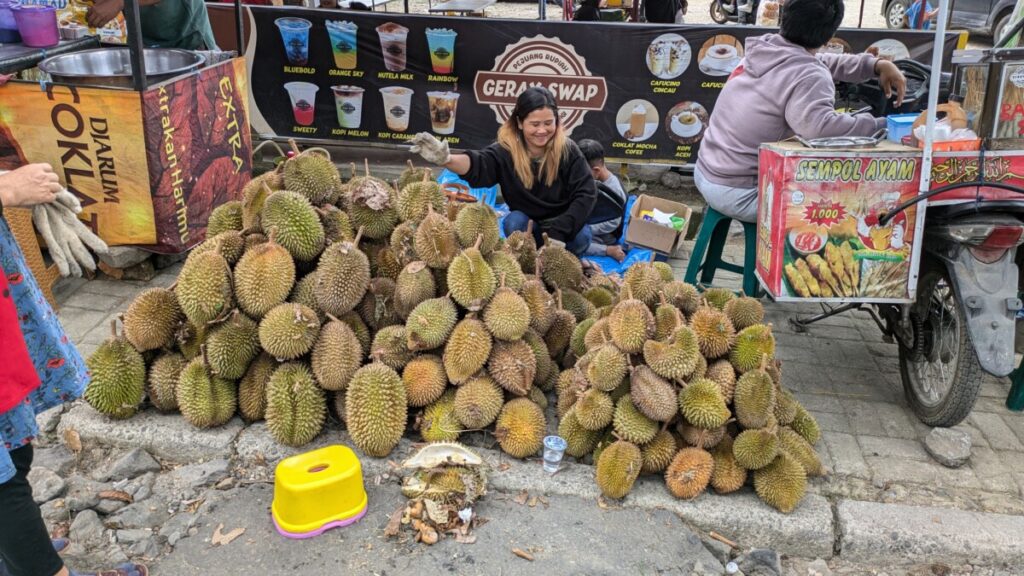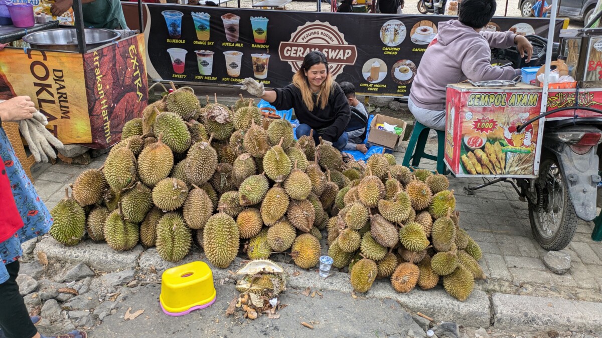 Ursprünglich wollten wir zum Schluss in Indonesien auch noch die Insel Java erkunden, aber Romana und ich entschlossen uns dazu, länger auf Sumatra zu verweilen, um es stressfrei genießen zu können. Deshalb entschieden wir uns dann für das 3-tägige Dschungeltrekking, man konnte nämlich zwischen 1 und 7 Tagen wählen. Wir hofften bloß, dass es für Romana nicht zu anstrengend wird, da sie schniefte, hustete und unter Appetitlosigkeit litt. Unser Guide Jajang und sein Assistent Ali versicherten uns aber, dass wir ein langsames Tempo gehen und viele Pausen machen würden. Bevor wir den Eingang zum Nationalpark erreichten, kamen wir noch an einer Durian-Plantage vorbei. Die Durian-Frucht ist ja aufgrund ihres starken Geruchs als Stinkfrucht bekannt, aber in ganz Südostasien sind die Leute verrückt danach. Jajang erklärte uns, dass es leider immer wieder zu Konflikten mit seltenen Tieren wie Sonnenbär, Orang Utan usw. kommt, da auch diese gerne Durian fressen, da logischerweise die oft armen Farmer aber auf die Ernte angewiesen sind.