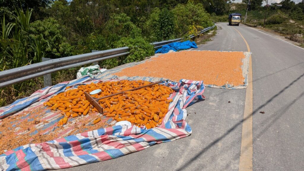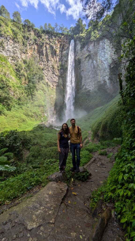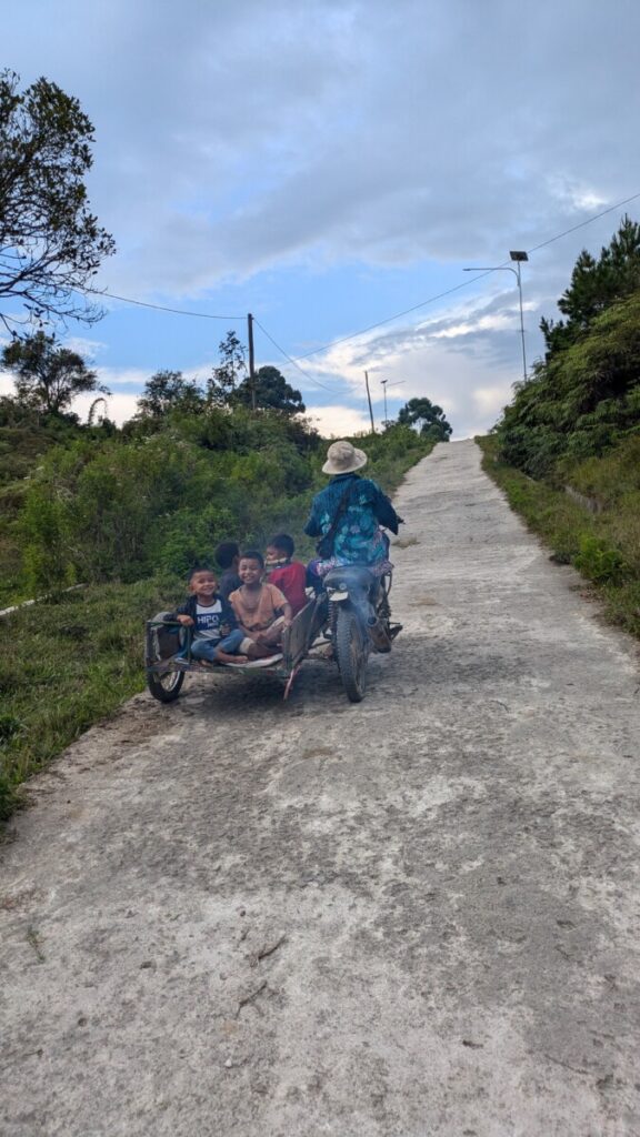 Samosir ist eine Insel im Lake Toba, also eine “Insel auf der Insel” sozusagen 😉 Auch hier ist das Klima sehr angenehm und nicht feucht, der See liegt auf 900 Meter. Die hier lebende Volksgruppe heißt Batak und ist berühmt für die traditionellen Häuser mit ihrer typischen Dachform. Wir verbrachten relativ ruhige vier Tage hier, außer dem nervigen Straßenlärm, den wir immer im Zimmer hörten, da die Türen und Fenster so schlecht schließen und den Schall ungehindert eindringen lassen. Da Romana ja gottseidank wieder fit war, erkundeten wir den südlichen Teil der Insel Samosir mit dem Roller und wollten dann für den Rückweg über eine kleinere Straße die Insel queren, die unsere OpenStreetMaps Offline-Karte als asphaltierte Straße anzeigte. Die ersten Kilometer waren ja noch befestigt, aber schon bald war es eine steile, ausgewaschene Schotterstraße. Als wir dann auf der Hochebene auf 1500m ankamen, dachten wir uns, jetzt wird der Weg hoffentlich besser werden, von einer Straße konnte man schon lange nicht mehr reden. Umkehren wollten wir auch nicht, denn es war schon fast 17:00 Uhr. Der schmale Pfad führte dann durch den Wald, immer wieder musste Romana absteigen, damit ich den Roller durch holprige Schlammstellen durchmanövrieren konnte. Das Gewitter am Nachmittag hatte es uns natürlich nicht einfacher gemacht – eine richtige Offroad Schlammschlacht mit einem Automatikroller 🙈 Was für eine Scheißidee diesen Weg zu nehmen, wären wir nur auf der guten asphaltierten Hauptstraße geblieben. Wir hofften, dass der Pfad überhaupt zur Ostseite der Insel führte und nicht irgendwo total zugewuchert endete. Außer Wasserbüffel war uns schon ewig niemand mehr entgegengekommen, wenigstens sah man einige frische Motorradspuren. Wir brauchten aufgrund des schwierigen Geländes ewig für die paar Kilometer, ob sich hierher überhaupt schon mal ein Tourist verirrt hat, fragen wir uns. Als uns dann ein Einheimischer auf dem Motorrad entgegenkam und uns erklärte, dass es nicht mehr weit sei zur Straße, waren wir sehr erleichtert! Dann hatten wir es geschafft, für die 18 Kilometer brauchten wir ca. 2 Stunden 😂
