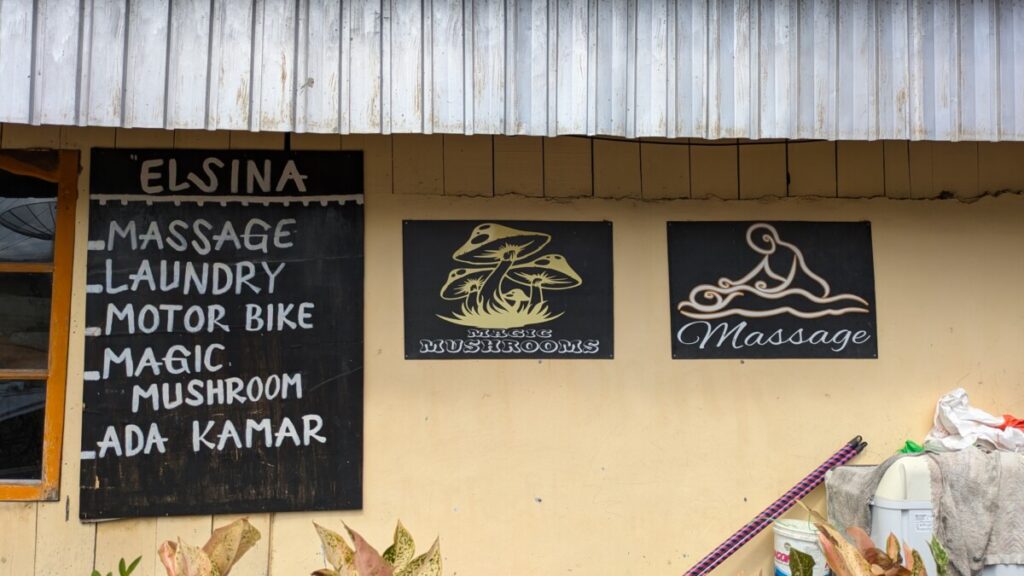 • Am Lake Toba gabs überall Magic Mushrooms zu kaufen 😂 Die „lustigen“ Pilze wurden direkt neben Wäscheservice und Massage beworben, alles Wichtige was man braucht, oder?