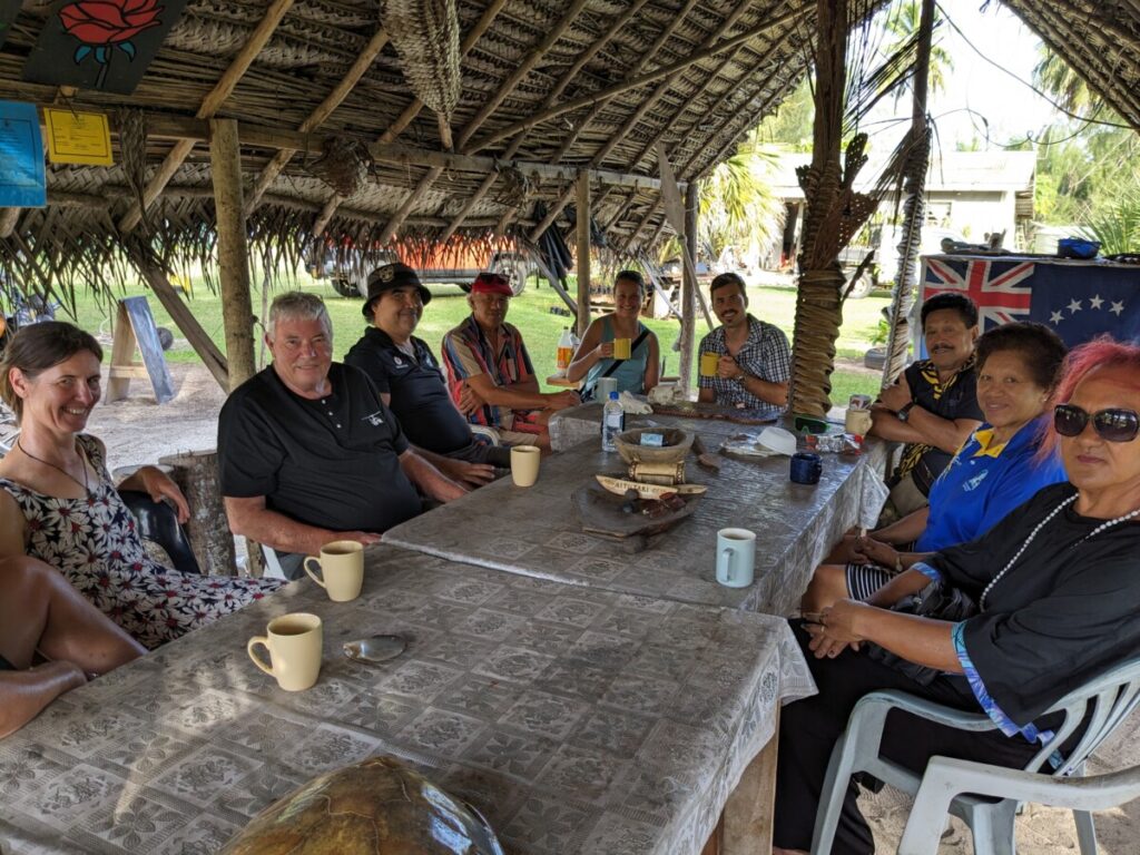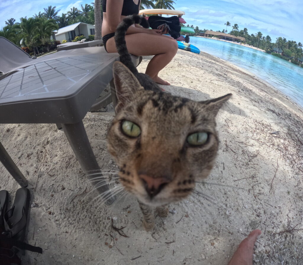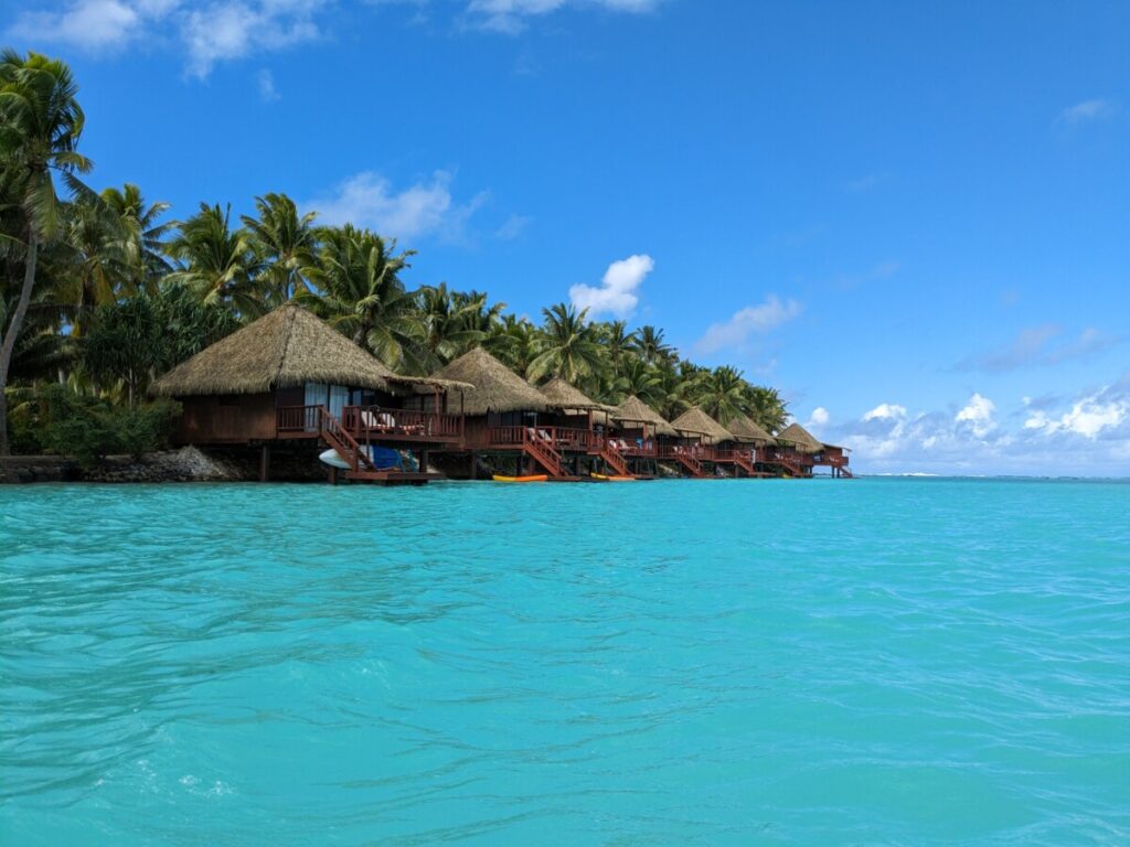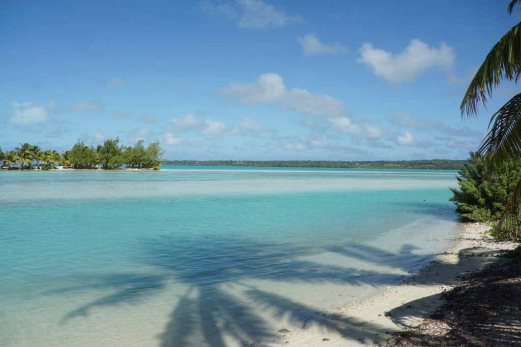 Bevor wir am Donnerstag in unsere nächste Unterkunft umzogen, besuchten wir noch die „Kofi Bar“, die uns aufgrund des Kaffees mit Kokosmilch empfohlen wurde. Die „Bar“ besteht eigentlich nur aus überdachten Plastiktischen und -stühlen, wo sich jeden Vormittag Leute zum Kaffeetrinken und Tratschen treffen. Als wir mit dem Roller ankamen, wurden wir sofort überschwänglich empfangen und in die Runde aufgenommen. Es wurde ein Witz nach dem anderen gemacht und so ziemlich jeder aufs Korn genommen. Die Sprache am Tisch war zwar meist englisch, ab und zu vervielen die Einheimischen aber auch in ihre eigentliche Sprache, dem Cook-Island-Maori. Das soll sich von der neuseeländischen Maori-Sprache ziemlich unterscheiden, waren die Cook Islander doch die Vorfahren davon. Der süße Kaffee war nicht schlecht, aber das eigentliche Highlight war schon die Stammtischrunde. Wir erfuhren zum Beispiel, dass auf Aitutaki die Ehe dann doch nicht so genau genommen wird und die Kinder oft viele mögliche Väter haben. Oder, dass die meisten Leute zu faul zum Kochen sind und es hausgemachte Speisen in den Geachäften zu kaufen gibt. Sehr interessant und amüsant die Gespräche hier, wir versprachen wiederzukommen, und fuhren zu unserer Villa zurück. Cathy machte uns in ihrer passiv-aggressiven Art dann klar, dass sie uns nur bis zum Flughafen bringen würde, obwohl unsere anschließende Unterkunft nur noch 2 km weiter gewesen wäre. So ganz sympathisch war sie uns beide nicht…Wir wollten die kurze Strecke dann einfach zu Fuß gehen, aber es dauerte keine zwei Minuten, bis ein netter Mann mit seinem Pickup anhielt und uns mitnahm. Die zweite Unterkunft war dann recht einfach und der Manager schon wieder etwas merkwürdig, aber die Strandlage mit Aussicht auf das türkise Wasser war super!