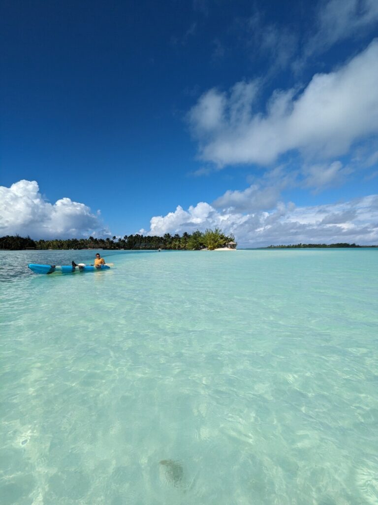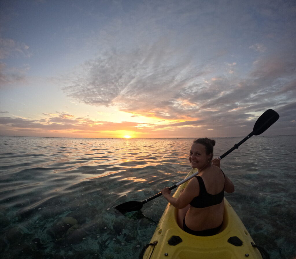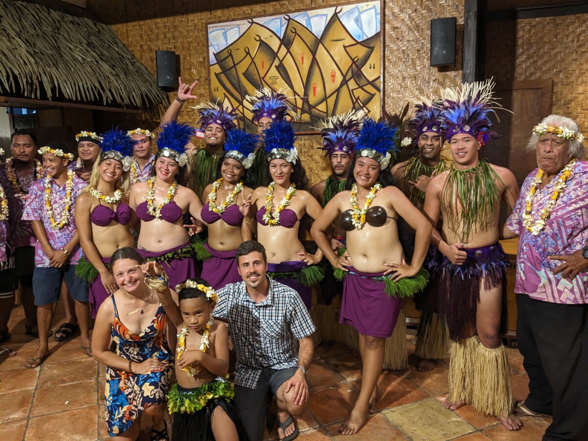Der Dienstag und der Mittwoch vergingen wie im Flug mit Schnorcheln, Kayaken, Lesen und Relaxen am und im Pool. Wir versuchten auch noch eine Lagunen-Tour mit Boot bei einem kleinerem Anbieter zu buchen, die nette Dame am Telefon sagte uns aber, dass es auf der Insel momentan keinen Sprit gibt und das Versorgungsschiff erst die nächsten Tage kommen würde. Die Knappheit der Ressourcen merkt man auch an den teilweise leeren Regalen in den kleinen Geschäften, hohen Preisen und den vielen angebotenen Konserven. So wollten wir uns einmal Eier kaufen, aber erst im vierten Laden bekamen wir welche.Für Mittwoch Abend hatten wir eine „Island Night“ in einem Hotel gebucht, also quasi Tirolerabend auf Cook-Insel-Art. Wir dachten uns natürlich schon, dass es eine Touristenbelustigung sein würde, aber einmal wollten wir uns so ein Spektakel halt ansehen. Zuerst spielte eine sogenannte String-Band, die die Ukelelen zum Glühen brachten. Nach dem ausgezeichneten Buffet kam die eigentliche Aufführung mit den Trommlern, Tänzerinnen und Kriegern. Speziell die Insulanerinnen hatten einen beeindruckenden Hüftschwung drauf 😉 Wir genossen einen schönen Abend mit Einblick in die polynesische Kultur, auch wenn wir danach Bauchweh hatten, weil wir uns beim Buffet nicht zurückhalten konnten 🙈