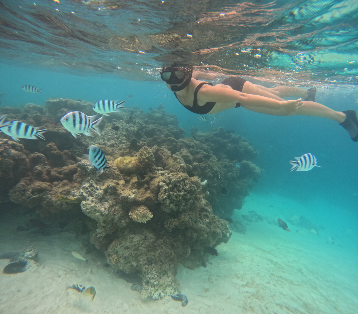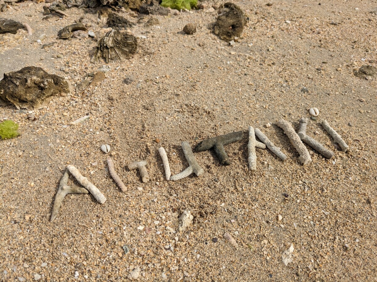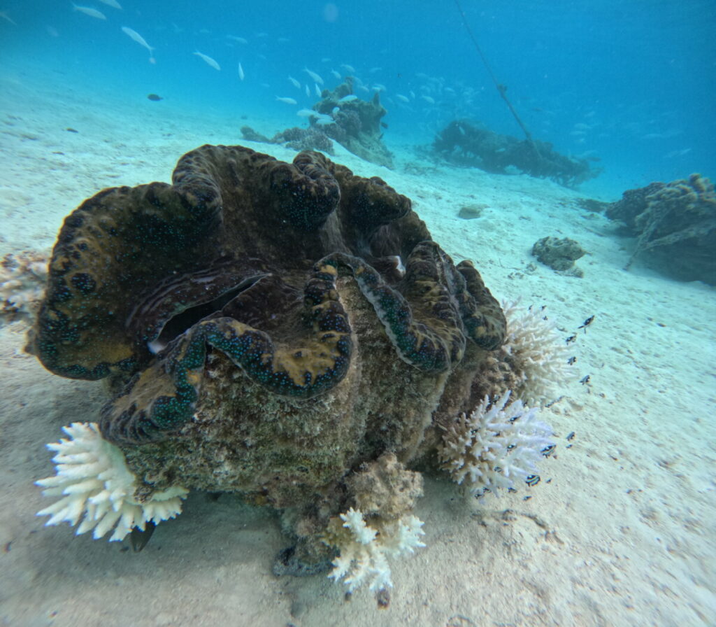 Nach der One-Foot-Island kam noch die Honeymoon-Island dran, die eine ewig lange Sandbank hatte, auf der man wunderbar entlangspazieren kann. Nicht weit davon entfernt war dann der letzte Stop, bei dem wir ein weiteres ultimatives Schnorchelerlebnis hatten. Ich hatte gerade die Taucherbrille aufgesetzt, als direkt vor uns ein meterlanger Giant Trevally (die Makrelen vom Hafen) vorbeizog. Es wimmelte vor kleinen Fischen, wir kamen uns vor wie in einem übergroßen Aquarium. Sogar Riesenmuscheln sahen wir, ebenfalls um einen Meter groß. Diese Dinger können bis zu 100 Jahre alt werden (steht zumindest auf Wikipedia)!