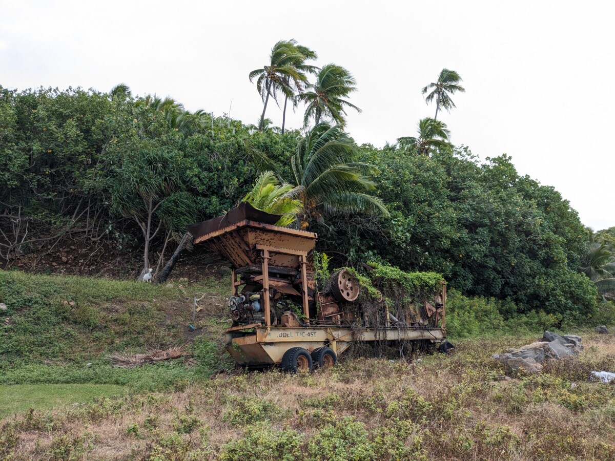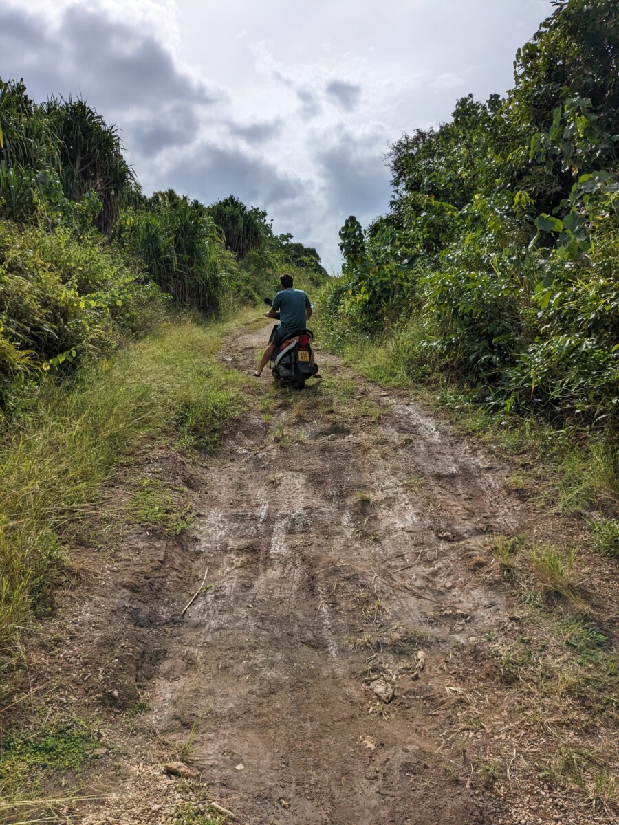 Am Nachmittag wurde das Wetter schon freundlicher und wir düsten gleich mit dem Roller über die halbe Insel, die nur ca. 7 km lang ist. Echt super, dass der Roller inkludiert ist, denn öffentliche Verkehrsmittel gibt es auf Aitutaki keine. Die Häuser sind viel einfacher als in Rarotonga, fast wie auf den Philippinen kommt es uns vor. Das Geld der Touristen scheint wohl in den Resorts zu bleiben, denn vieles scheint etwas heruntergekommen oder als würde es Wartung benötigen. Mit Helm fährt hier niemand auf der Insel, aber das Verkehrsaufkommen ist überschaubar und die meisten kriechen im Schneckentempo die Straße entlang. Entgegenkommende Einheimische heben oft die Hand zum Gruß oder nicken uns freundlich zu. Die Straße zur höchsten Erhebung der Insel, dem 124 Meter hohen Maunga Pu, war dann ein besserer Traktorweg und ziemlich zugewachsen. Unsere Offlinekarte am Handy war da vielleicht nicht mehr ganz aktuell, einige Straßen und Wege scheinen aufgegeben und der Natur überlassen worden zu sein.