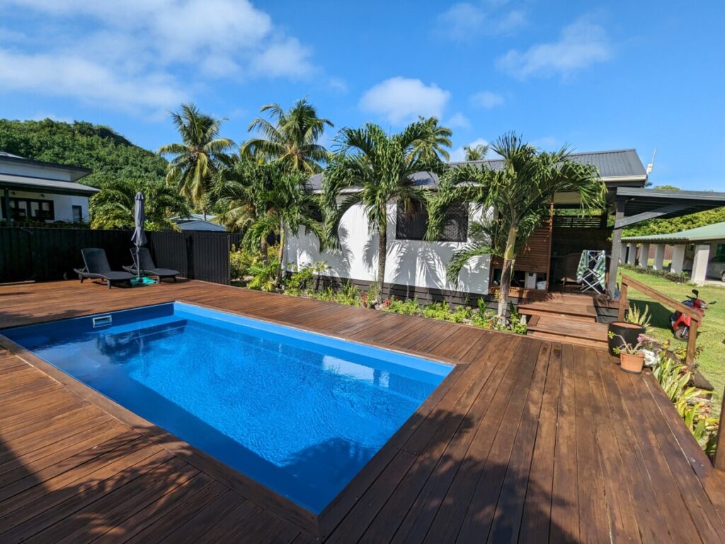 Als wir in Aitutaki gelandet sind, war das Wetter nicht so, wie wir es uns vorgestellt hatten – es regnete. Das ist hier in den Tropen aber nichts ungewöhnliches, nicht umsonst ist trotz der starken Sonne alles grün bewachsen. Unsere Gastgeberin, die komischerweise schon wieder Cathy hieß, empfing uns mit duftenden Blumenketten im winzigen, offenen Flughafengebäude. Nach kurzer Fahrt im Pickup waren wir schon da bei unserer kleinen „Villa“. Für 160€ die Nacht bekamen wir eine moderne Unterkunft mit eigenem Pool, Strand und Automatikroller geboten. Obwohl dies schon unser Budget hoffnungslos sprengte, ist das noch richtig billig im Vergleich zu den Resorts, dort blättert man für eine Nacht 500€ aufwärts hin.