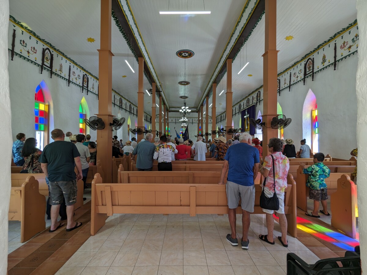 Der Sonntag begann mit einem Frühstück im Pacific Resort, das überraschenderweise ziemlich günstig war. Danach fuhren wir zur größten Kirche auf Aitutaki, der Cook Islands Christian Church, um die Sonntagsmesse um 10 Uhr zu besuchen. Die CICC ist die älteste Kirche der Cook Inseln und wurde um 1828 gebaut. Die Cook Islander sind ja zum Großteil sehr gläubig und bekannt dafür sehr gut singen zu können. Die Messe dauerte dann geschlagene anderthalb Stunden und wir verstanden nicht viel, denn das meiste war auf Maori. Aber der Gesang ging wirklich unter die Haut – die Einheimischen sangen mehrstimmig aus voller Brust. In der Kirche trafen wir sogar wieder einige Leute von der Kofi Bar Runde und hatten gleich ein Gespräch.