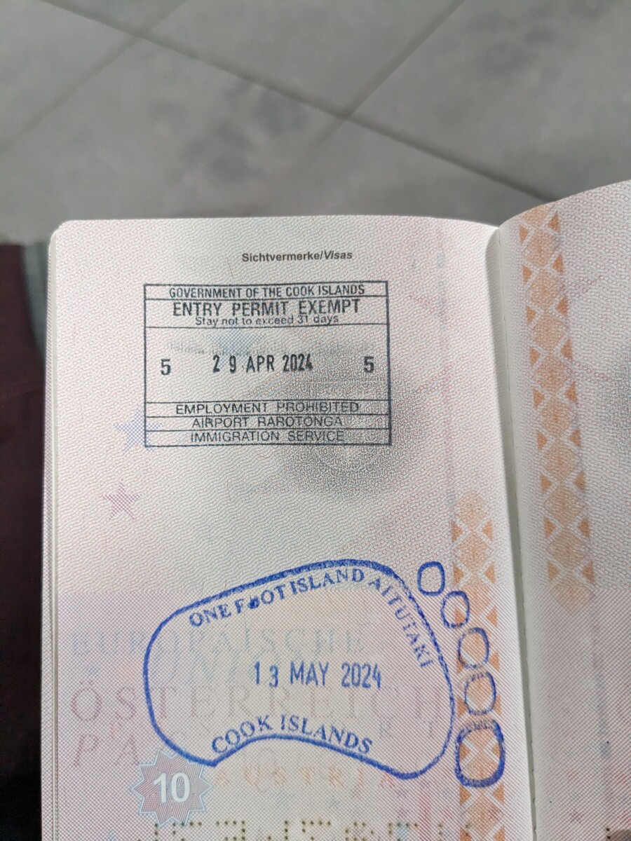 Der Wetterbericht für die nächsten Tage war nicht so gut, aber wir dachten uns, was soll’s, und buchten für Freitag dann die Lagunen-Bootsfahrt. Nur noch ein anderes Paar aus Neuseeland war auf dem 250 PS starken Boot, und als wir dann raus fuhren, zeigte sich sogar die Sonne. Beim Halt auf der ersten Insel öffnete uns der Guide eine gekeimte Kokosnuss. Der sonst mit Kokoswasser gefüllte Hohlraum besteht nur noch aus einem festen Schaum, der wunderbar süß und nach Kokos schmeckt – eine echte Delikatesse! Es ging weiter auf die unbewohnte One-Foot-Island. Die Wasserfarbe war unbeschreiblich, das haben wir nicht mal auf den Philippinen so gesehen. Das „Post Office“ Gebäude auf der Mini-Insel wurde nur für die Touristen gebaut. Dort kann man sich einen Fußabdruck-Stempel für den Reisepass holen, aber nur, wenn man die Lagunentour mit einem gewissen Anbieter macht. Wir holten uns den Stempel einfach nachträglich 😉